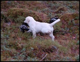 Meeri pääsi myös etsimään metsästä pari varista. Rohkeasti ja valtavalla innolla paineli hakemaan ja yhtä innokkaasti palautti vaikka linnun siivet hieman haittasivat liikkumista. Toinen varis tulikin varsin hyvällä otteella. Siinäpä ne Meerin treenit sitten olikin moneksi kuukaudeksi. ![]() Taipumuskokeen Meeri läpäisi päivälleen kahdeksan kuukauden ikäisenä v. 2008. Sen jälkeen alkoikin puolitoista vuotta kestänyt treenitauko, koska Meerin piti lähteä sijoitukseen loppukesästä, kunhan ko. perheen talo valmistuisi. Perheessä tapahtuneen vakavan sairastumisen vuoksi, Meerin muutto siirtyi syksyyn 2009. Ja niin siinä sitten kävi, etten enää raskinutkaan luopua Meeristä, jolla oli jo ikääkin kaksi vuotta. ![]() Talven ja kevään aikana v. 2010 aloitimme melko säännöllisen harjoittelemisen, tavoitteena osallistua joskus NOME-B -kokeeseen. Ihan alkeista jouduttiin aloittamaan: paikalla pysyminen, luovutukset käteen, vapaana seuraaminen jne. Harjoituksia tehtiin pääasiassa dameilla, mutta myös erilaisia riistoja käytetiin. Onneksi Meerillä on kova työinto ja mitä enemmän tehtiin, sitä enemmän Meeri halusi tehdä, yhdessä. ![]() Vuonna 2011 kävimme sekä keväällä että syksyllä Kati Tuomisen NOME -koulutuksissa Merimaskussa. Yllä muutama kuva kurssin lopuksi järjestetystä harjoituskokeesta. Osallistuttiin myös jäsentenvälisiin, epävirallisiin kokeisiin ja toukokuussa viralliseen NOME-B kokeeseen. Siitä saimme tulokseksi viivan eli keskeytin kokeen. Meeri suoritti kyllä markkeerauksen ja ohjauksen, mutta seuraaminen ja luovutukset oli huonoja. Syksystä 2011 kevääseen 2012 treenattiin oman, neljän koirakon porukan kanssa. Syksyllä 2012 päästiin mukaan Mikko Laaksosen treeniporukkaan. Tehtiin pääasiassa vesiohjauksia ja -markkeerauksia. Maastot oli meille uusia ja melkoisen haastaviakin. Kiitos Mikolle, saatiin uutta intoa harjoitteluun ja kasapäin hyviä neuvoja. Myös vesi tuli Meerille hyvin tutuksi työskentelyelementiksi. ![]() Lokakuussa osallistuttiin Auran Nuuskujen NOME-B -kokeeseen Mjösundissä. Yllä muutama Kastepohjan Markun ottama kuva. Kiitos hänelle, kun jaksaa aina olla paikalla kuvaamassa koirien suorituksia. Kuva 1. Kätellään tuomari Risto Heikkonen ja Meerillä jo selkeä päämäärä kohti tuomarin syliä. Onnistuihan se! Kuva 2. Tässä Meeri Lepakkokorva palauttaa varista. Ei tänne ole tultu himmailemaan! Kuva 3. Onnistun nappaamaan viimeisen lokin Meeriltä juuri ennen, kun se putoaa maahan. Mikä loppuhuipennus! Meerin kanssa lintujahdissa kaatopaikalla lokakuussa 2014: ![]() Näissä kuvissa näkyy maastoa, missä koiran pitää työskennellä. Ampuja on 1-kuvassa näkyvän korkean kallion päällä. Kuva-2